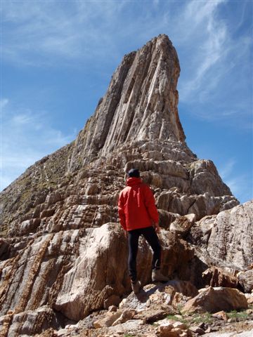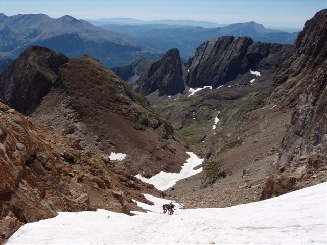 | ... el tercero de los cuales es el Diente Royo (3010m) que presenta una pared muy vertical, que se rodea por la izquierda para acceder a una repisa evidente desde la cual se asciende en zig-zag por terreno amplio y descompuesto... |