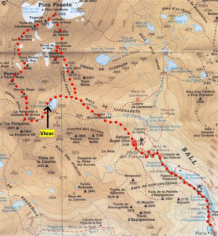 10-08-2008 Vivac junto al Ibón de Llardaneta (2650m) - Cresta Espadas-Posets - Camping Ixeia (1250m) Benasque |