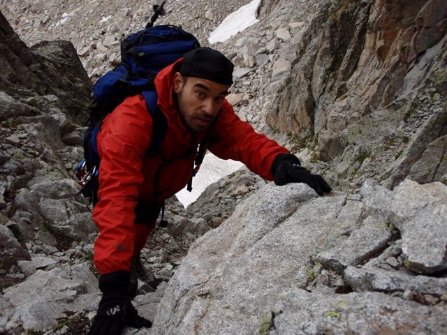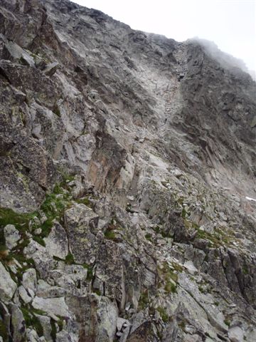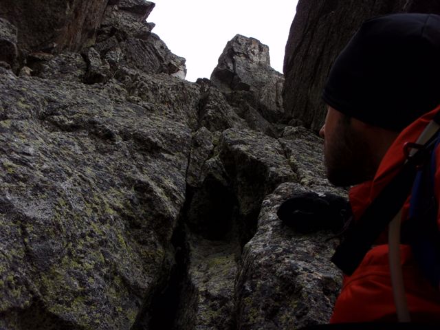 | ... trepando un poco por un corredor de piedra suelta, pero sin ninguna dificultad seria... |