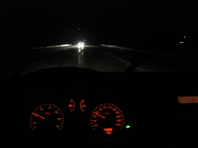 | Por la cabeza, miles de pensamientos y dudas: "¿por que hago esto?, ¿merecerá la pena?, otra vez solo" etc. etc. etc... Uno llega a preguntarse muchas tonterías cuando conduce solo en la oscuridad de la noche. |