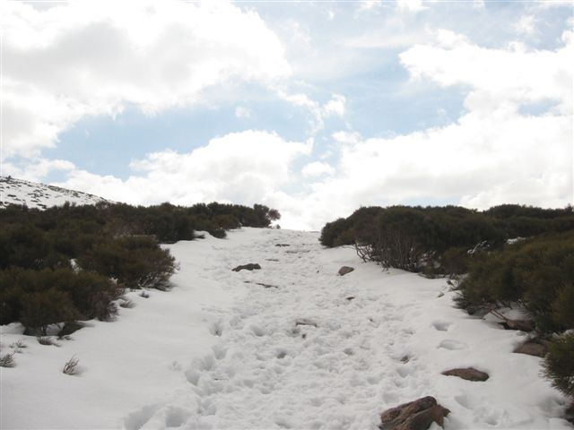 | ... por una pendiente no muy pronunciada pero con una nieve blanda que dificulta el paso, y con lo cargado que voy, me hace dar más de un resbalón. |