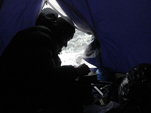 | ... tuvimos que retirarnos, sin saber muy bien hacia dónde, en medio de una fuerte ventisca, y pasar una larga noche completamente empapados dentro de las tiendas de campaña. |