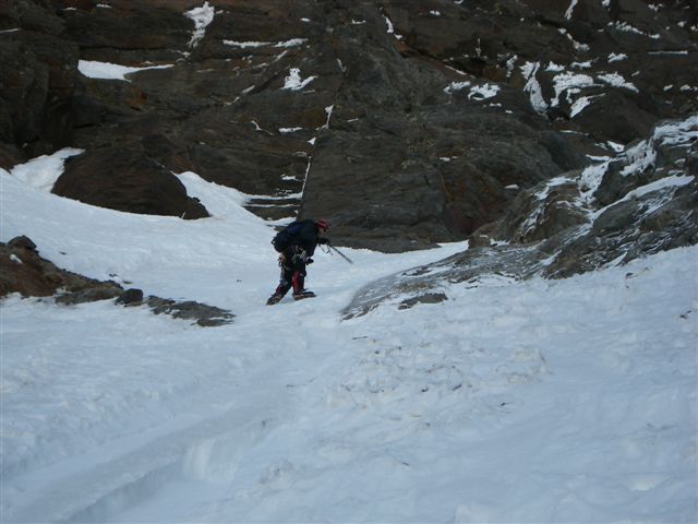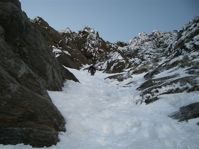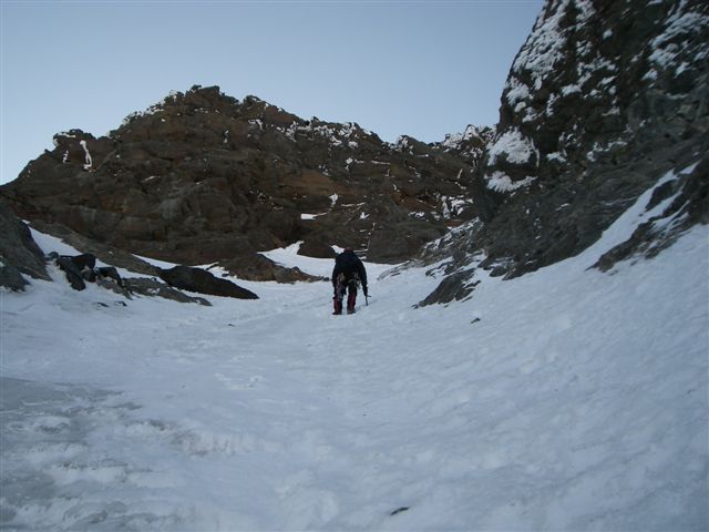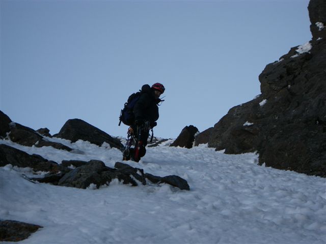 ... hasta llegar al primer paso de dificultad, un estrechamiento de hielo duro donde hay que tirar de piolet y crampones para subir, pero lo hacemos fácil y no sacamos la cuerda de la mochila... |