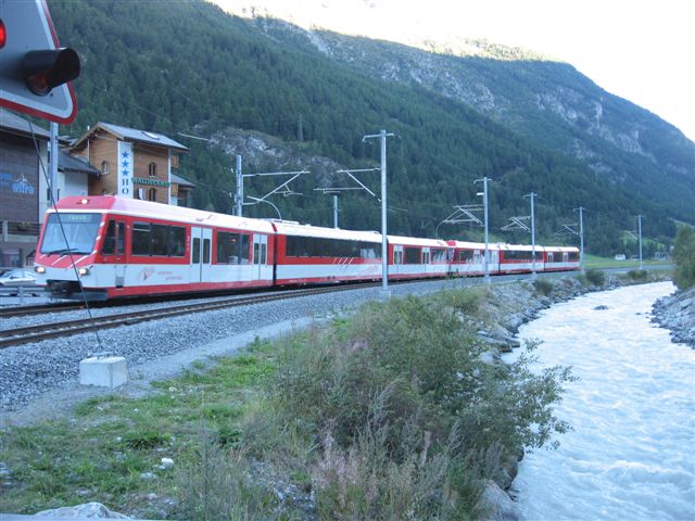 | A partir de aquí, para llegar a Zermatt (1608m), hay que coger un tren que tarda unos 20 minutos, o un taxi que tarda unos 10, o ir andando y tardar hora y cuarto. |