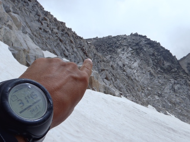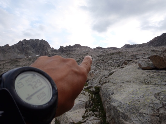 | Está muy claro que aquel es el Pico Bondidier (3146m). Pero, ¿os imagináis esto con niebla y sin el GPS?... |