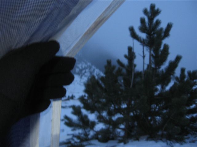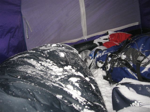 La noche ha sido muy tranquila escuchando ese romántico sonido que producen los copos de nieve al caer sobre el techo de la tienda... |