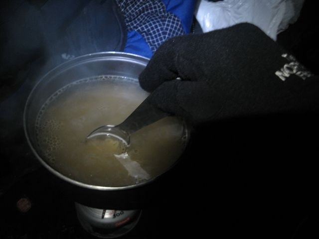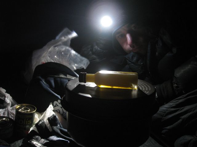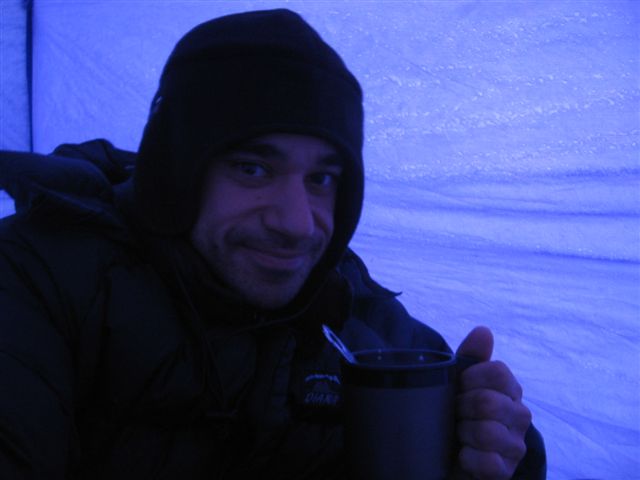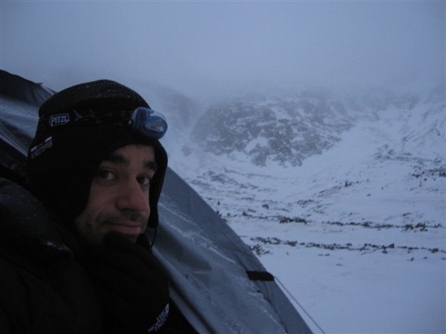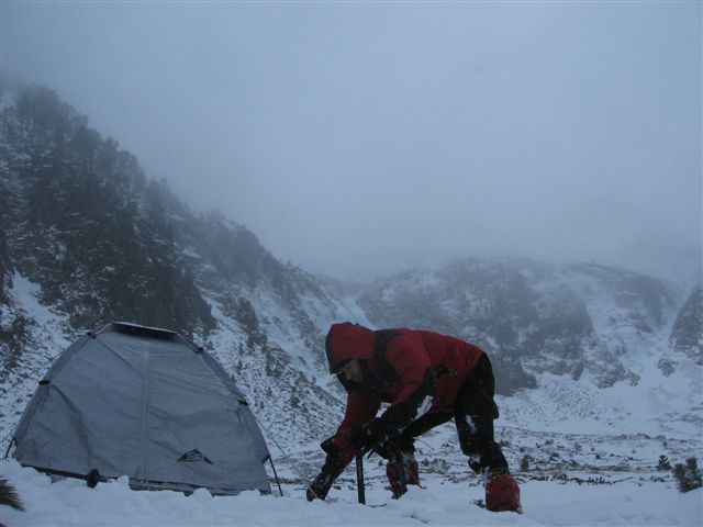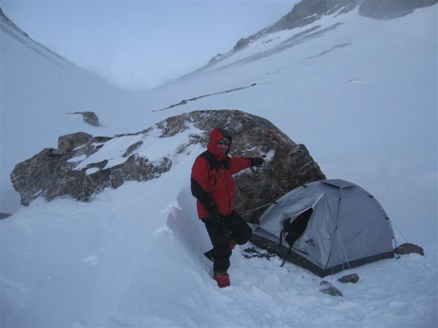 ... después de ponerme los guantes gruesos y pasar unos momentos de dolor y preocupación, recupero la sensibilidad en las manos y me peleo un buen rato con el viento y las piedras para poder montar la tienda. |