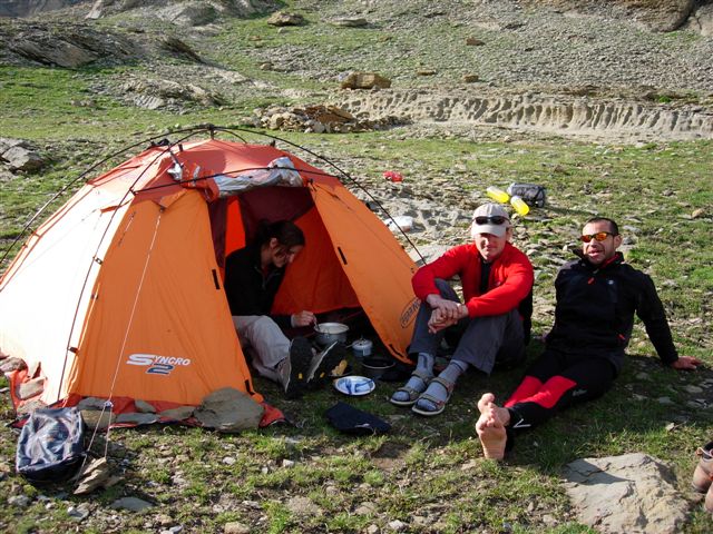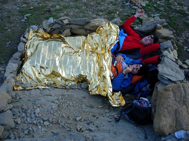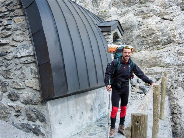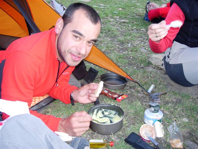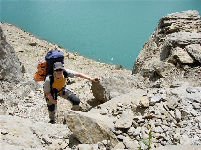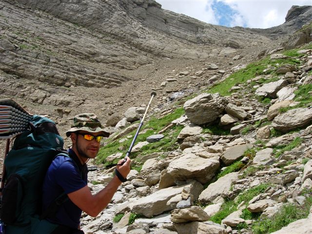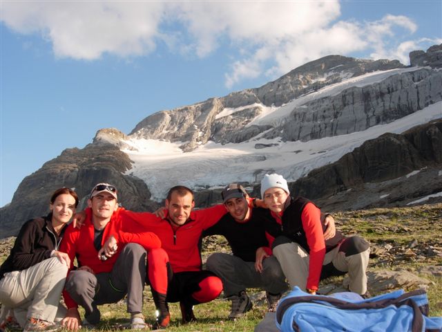 El equipo tiene que separarse al iniciar la ascensión del Monte Perdido para solucionar un pequeño contratiempo y, así, en dos pequeños grupos, llegamos al bacón de Pineta al lago Marboré y al refugio de Tucarroya, donde repondremos energías y hasta dormiremos la siesta. Más tarde, nos reagrupamos todos a los pies de la cara norte del Monte Perdido y su glaciar colgante. Allí pasaremos la noche. |